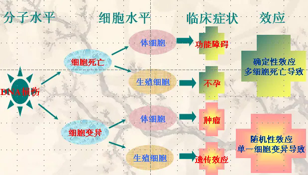 1.随机性效应:无剂量阈值有害效应的严重程度与受照剂量大小无关,任何微小的剂量也可引起效应,只是发生的几率极其微小而已。如:致癌效应(癌症 、白血病) ; 遗传效应(损伤发生在具有遗传信息的功能细胞上,发生的效应将显现在受照者的后代身上)。