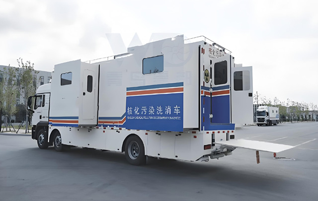 核化污染洗消车能够实现快速发展开展被核化污染管理人员的现场去污洗消,可放置在核化损伤救治基地建设作为一个二次洗消用房。在核化突发事件中,核化污染洗消车化学放射物质洗消的首选装备。