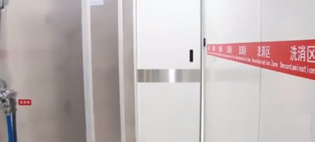 洗消区共设有5个洗消位每个洗消位都配备相应的洗消设施、洗消指导标识,配备洗消标识、花洒清洗液体标识。